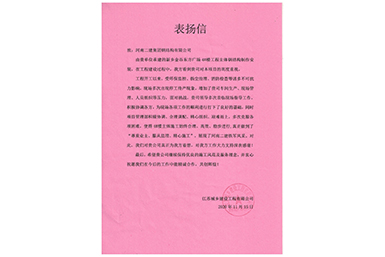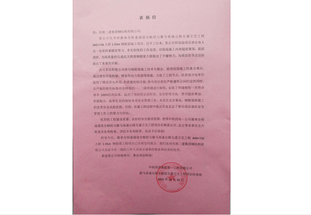 282021.01中鐵四局集團第一工程有限公司向河南二建集團鋼結(jié)構(gòu)有限公司發(fā)來表揚信 -